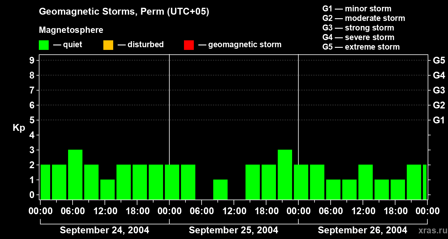 Changes in the geomagnetic index Kp from September 24 to 26, 2004 for mid latitudes