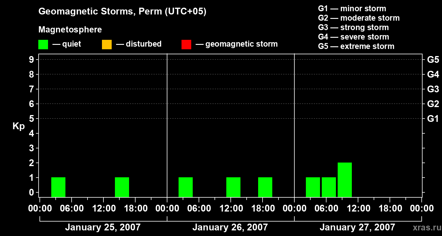 Changes in the geomagnetic index Kp from January 25 to 27, 2007 for mid latitudes