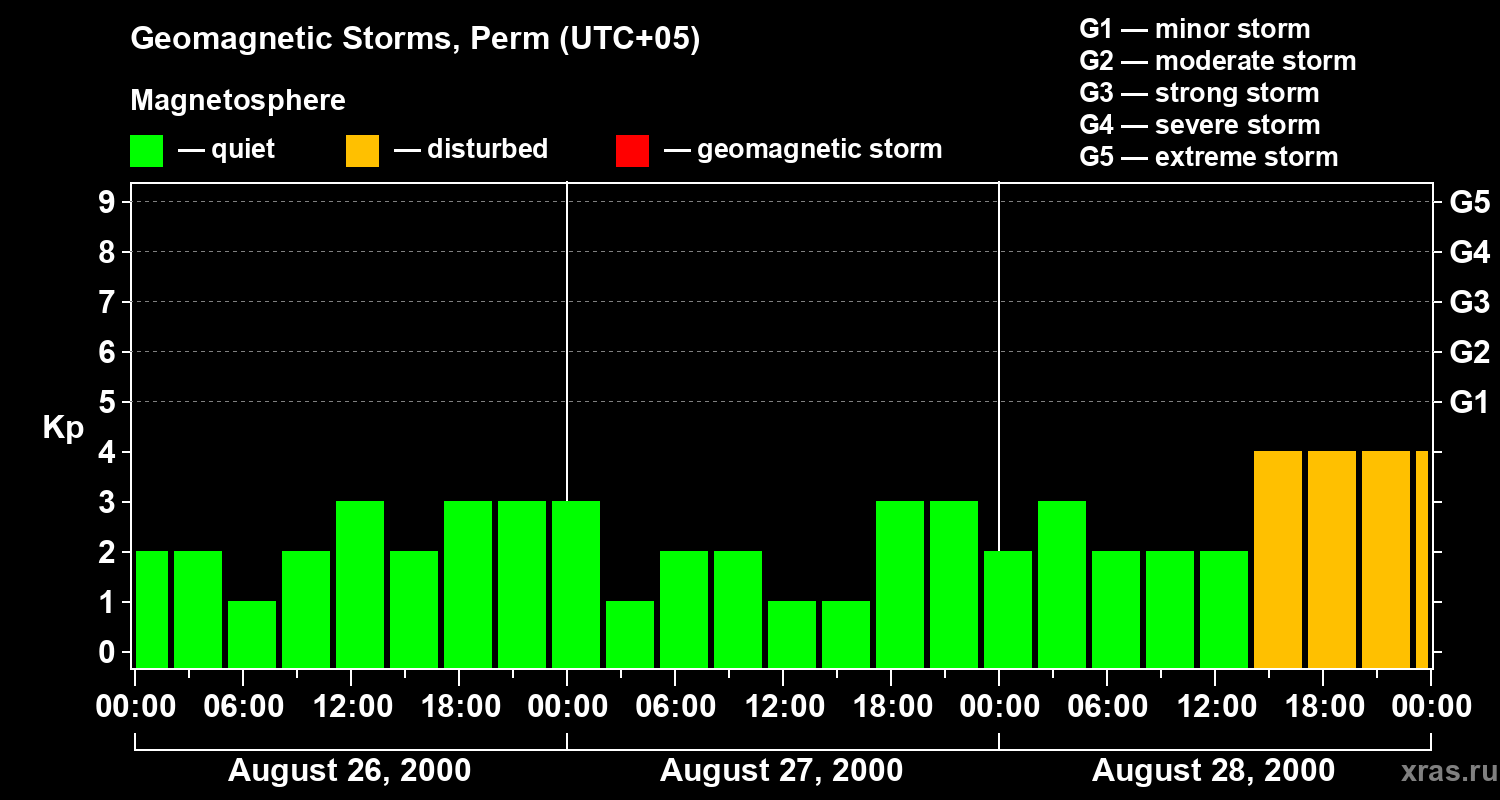 Changes in the geomagnetic index Kp from August 26 to 28, 2000 for mid latitudes