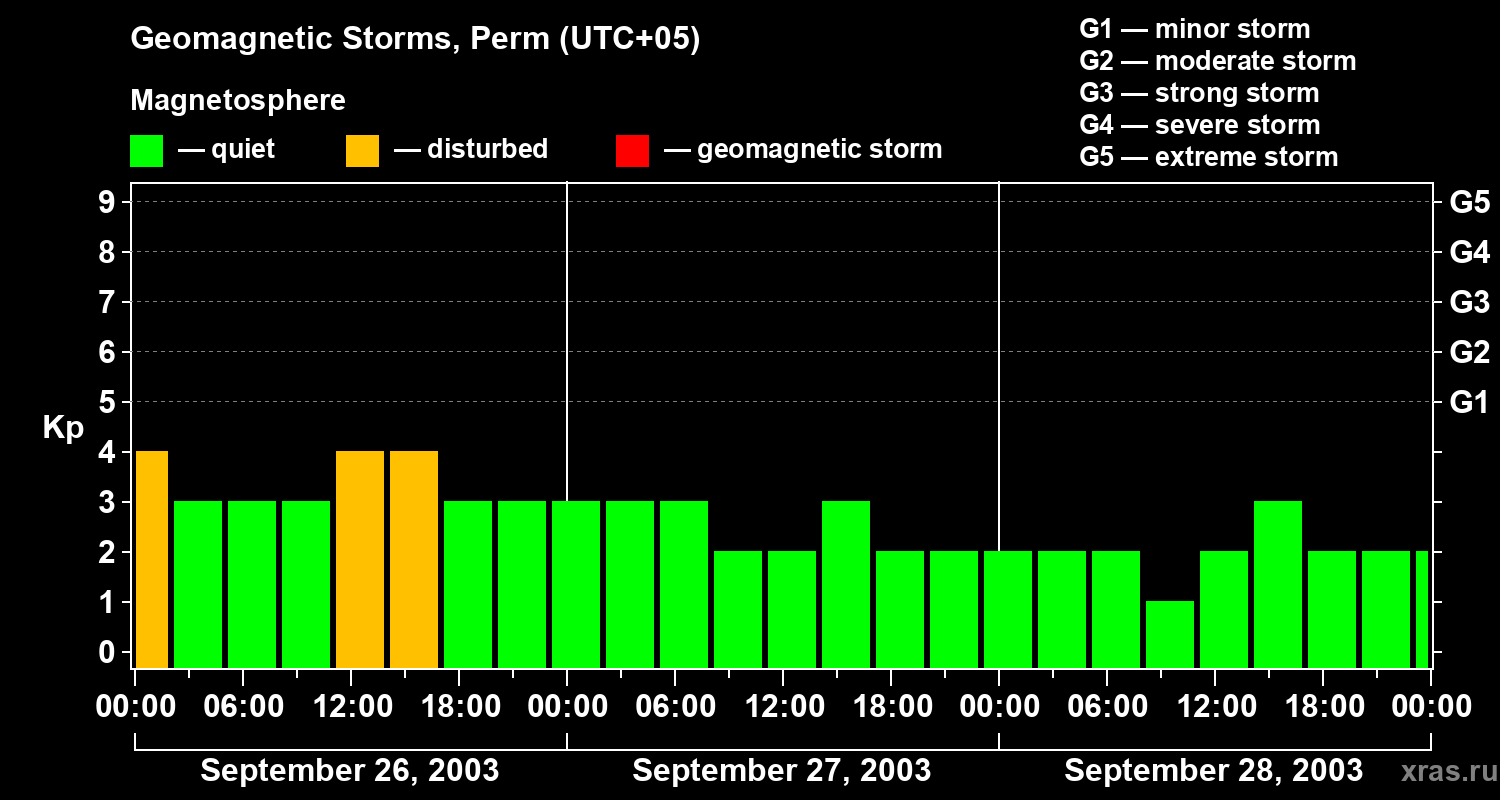 Changes in the geomagnetic index Kp from September 26 to 28, 2003 for mid latitudes