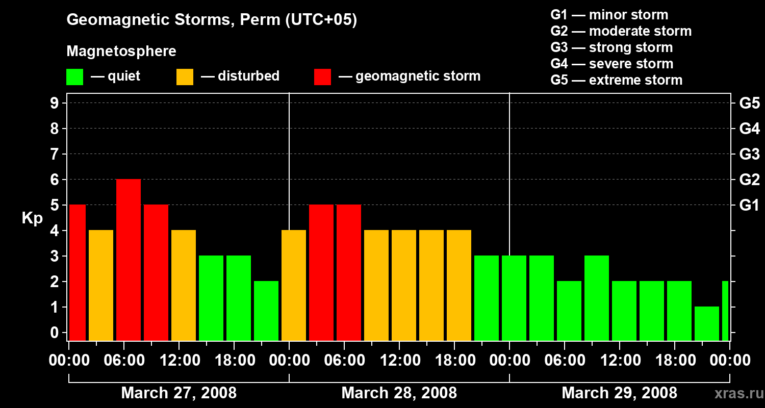 Changes in the geomagnetic index Kp from March 27 to 29, 2008 for mid latitudes