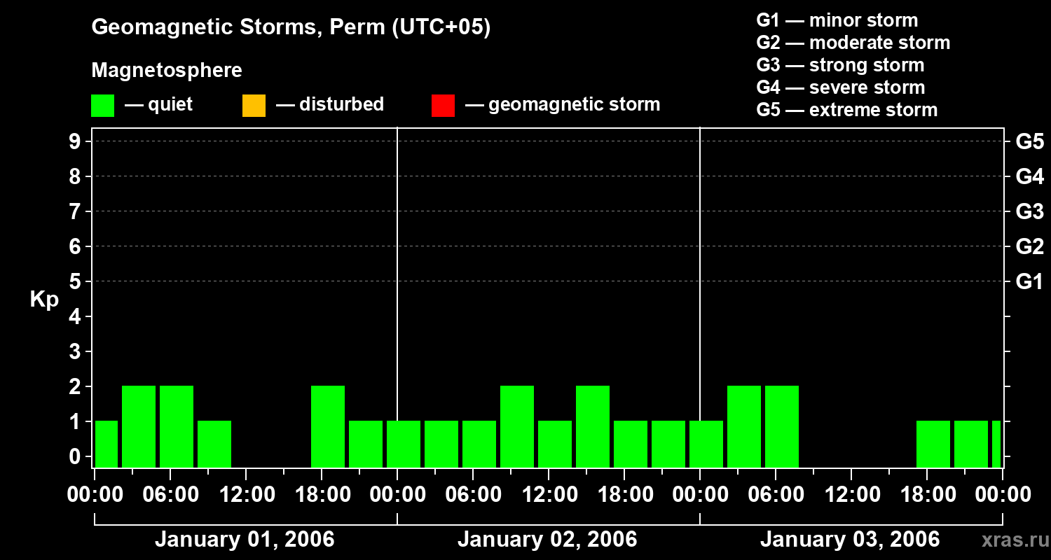 Changes in the geomagnetic index Kp from January 1 to 3, 2006 for mid latitudes