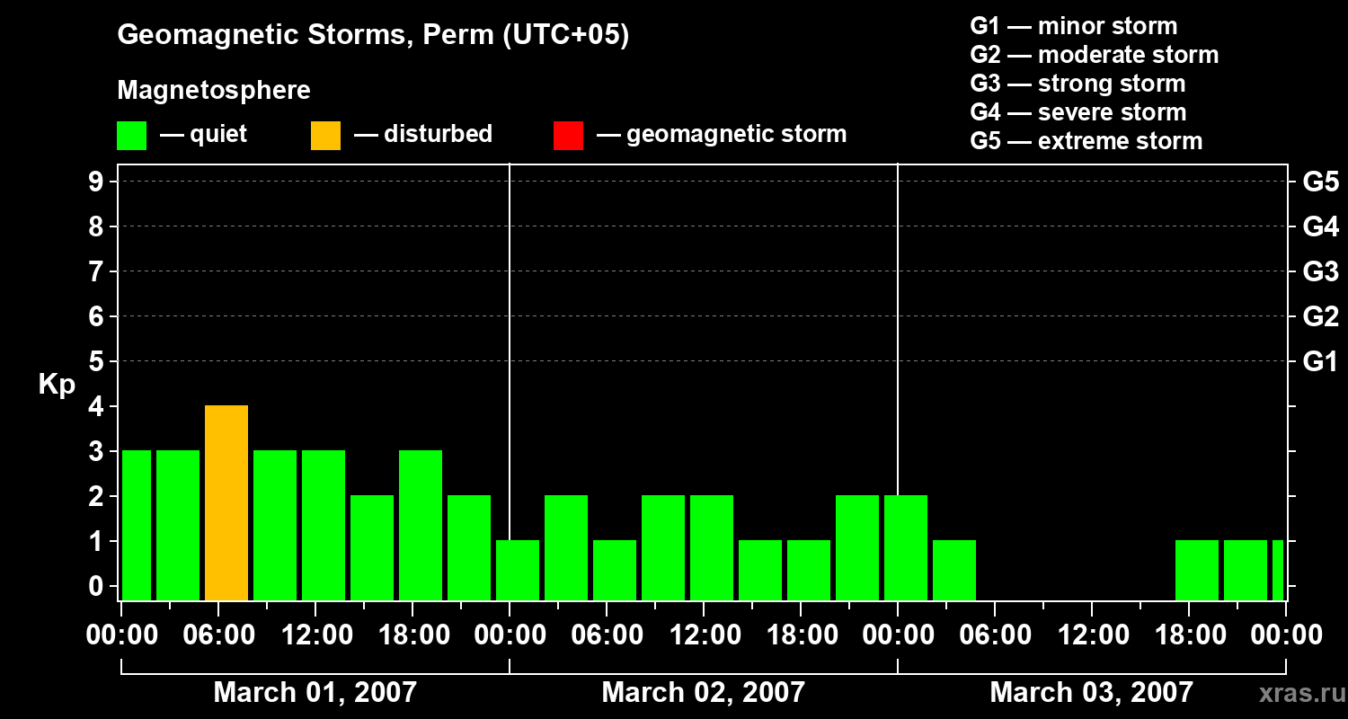 Changes in the geomagnetic index Kp from March 1 to 3, 2007 for mid latitudes