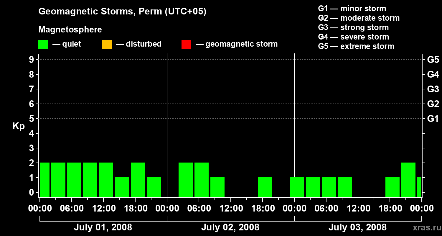 Changes in the geomagnetic index Kp from July 1 to 3, 2008 for mid latitudes