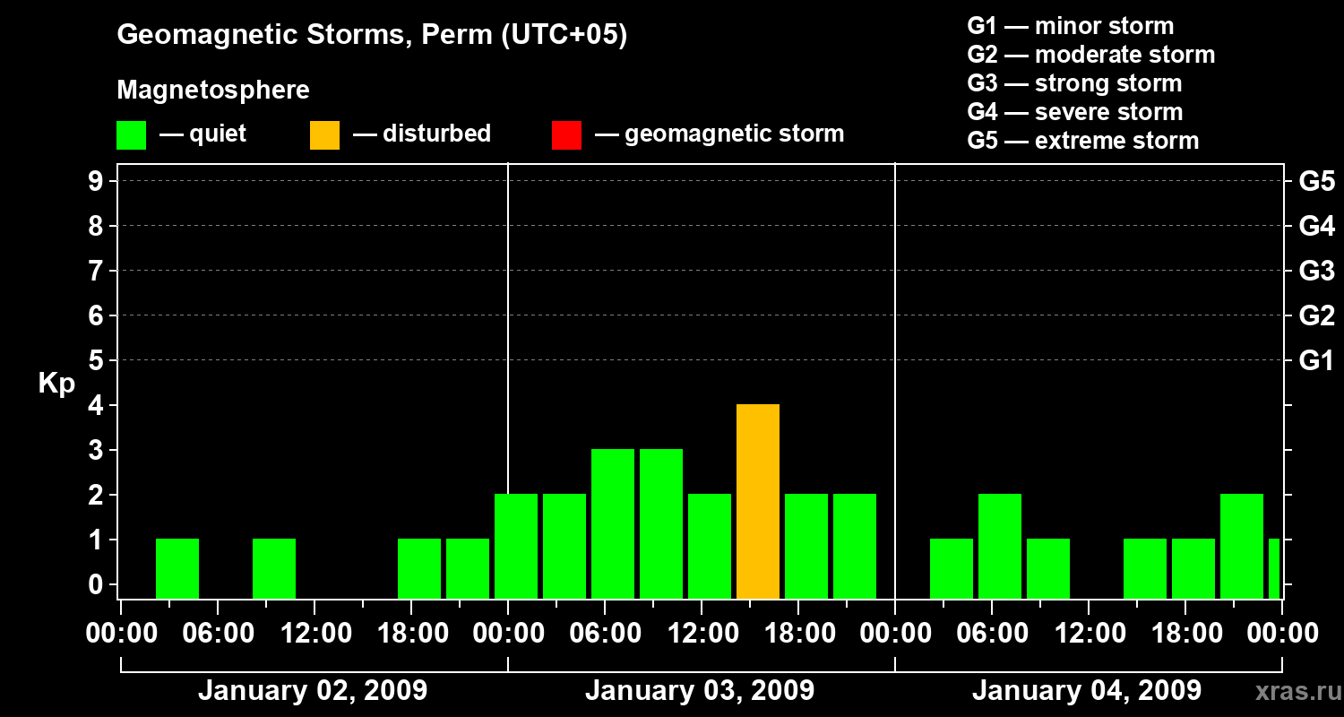 Changes in the geomagnetic index Kp from January 2 to 4, 2009 for mid latitudes