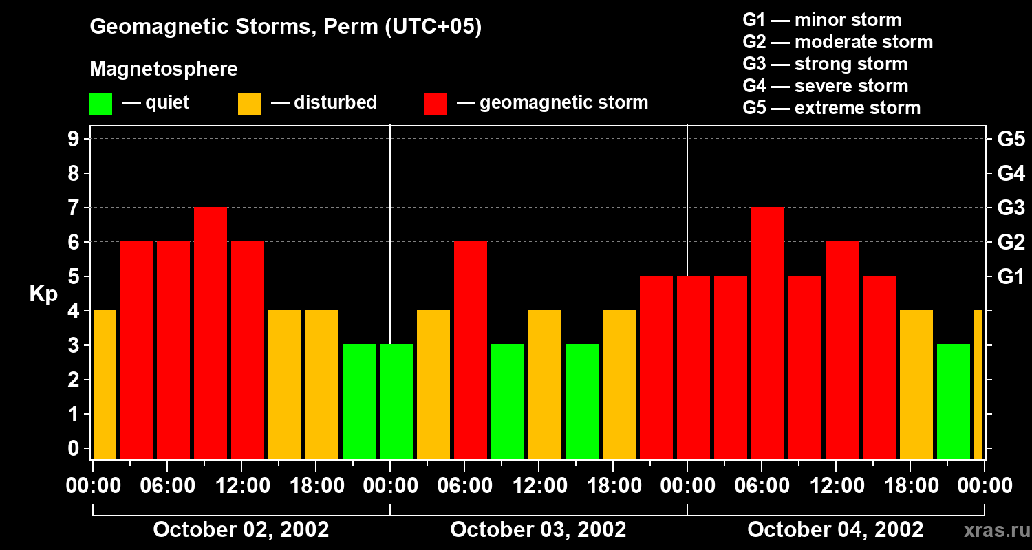 Changes in the geomagnetic index Kp from October 2 to 4, 2002 for mid latitudes