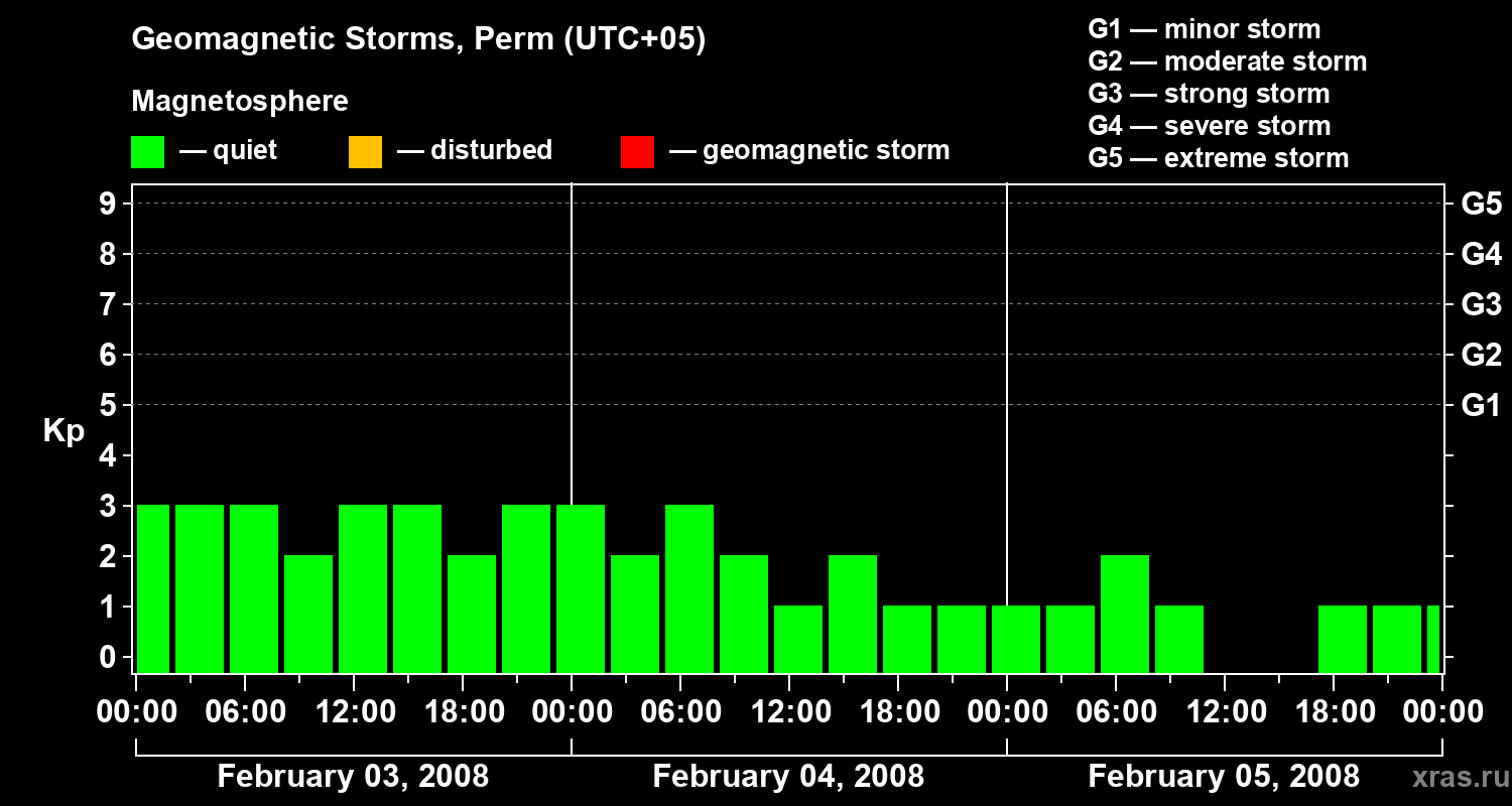 Changes in the geomagnetic index Kp from February 3 to 5, 2008 for mid latitudes