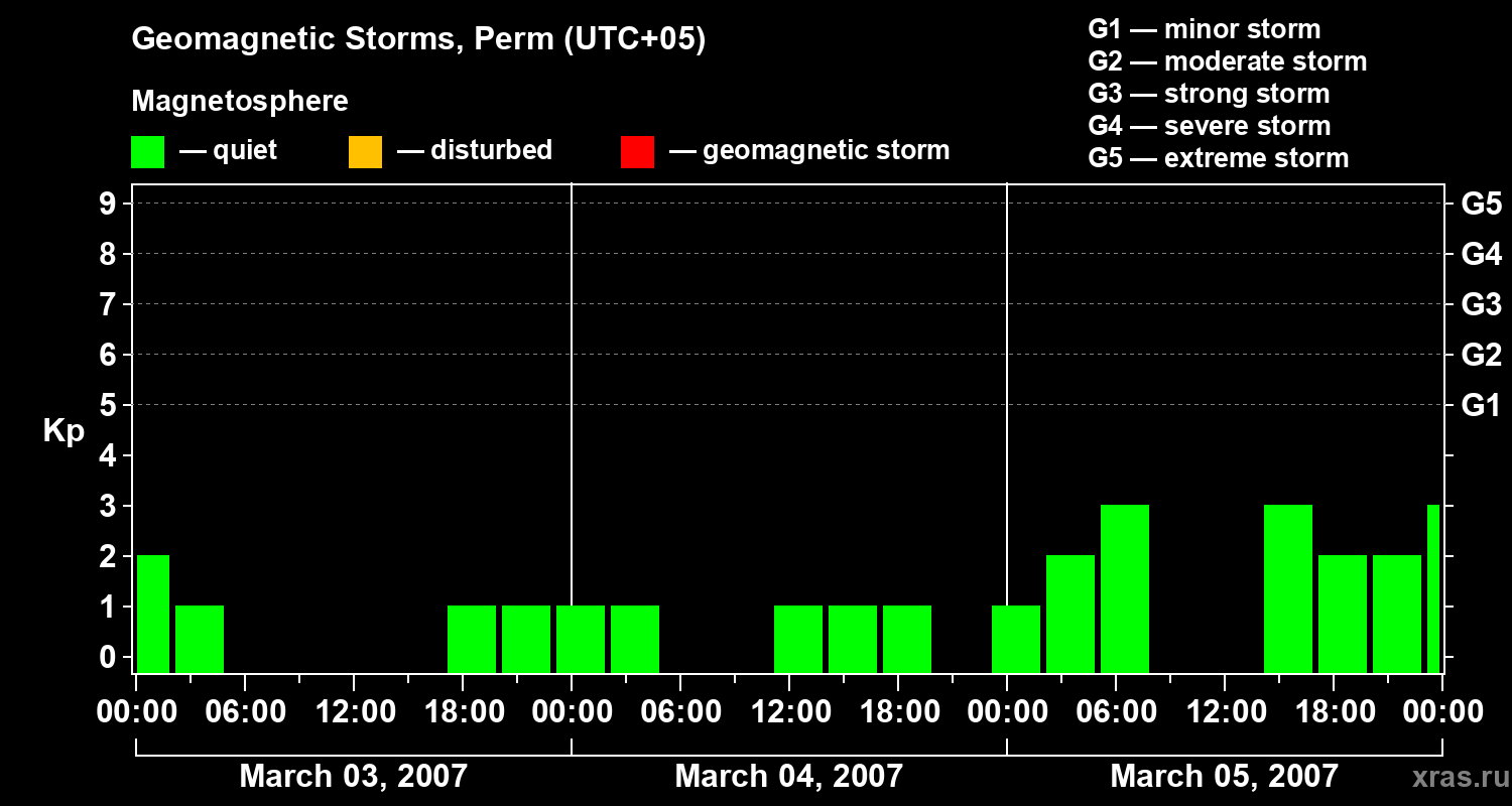 Changes in the geomagnetic index Kp from March 3 to 5, 2007 for mid latitudes