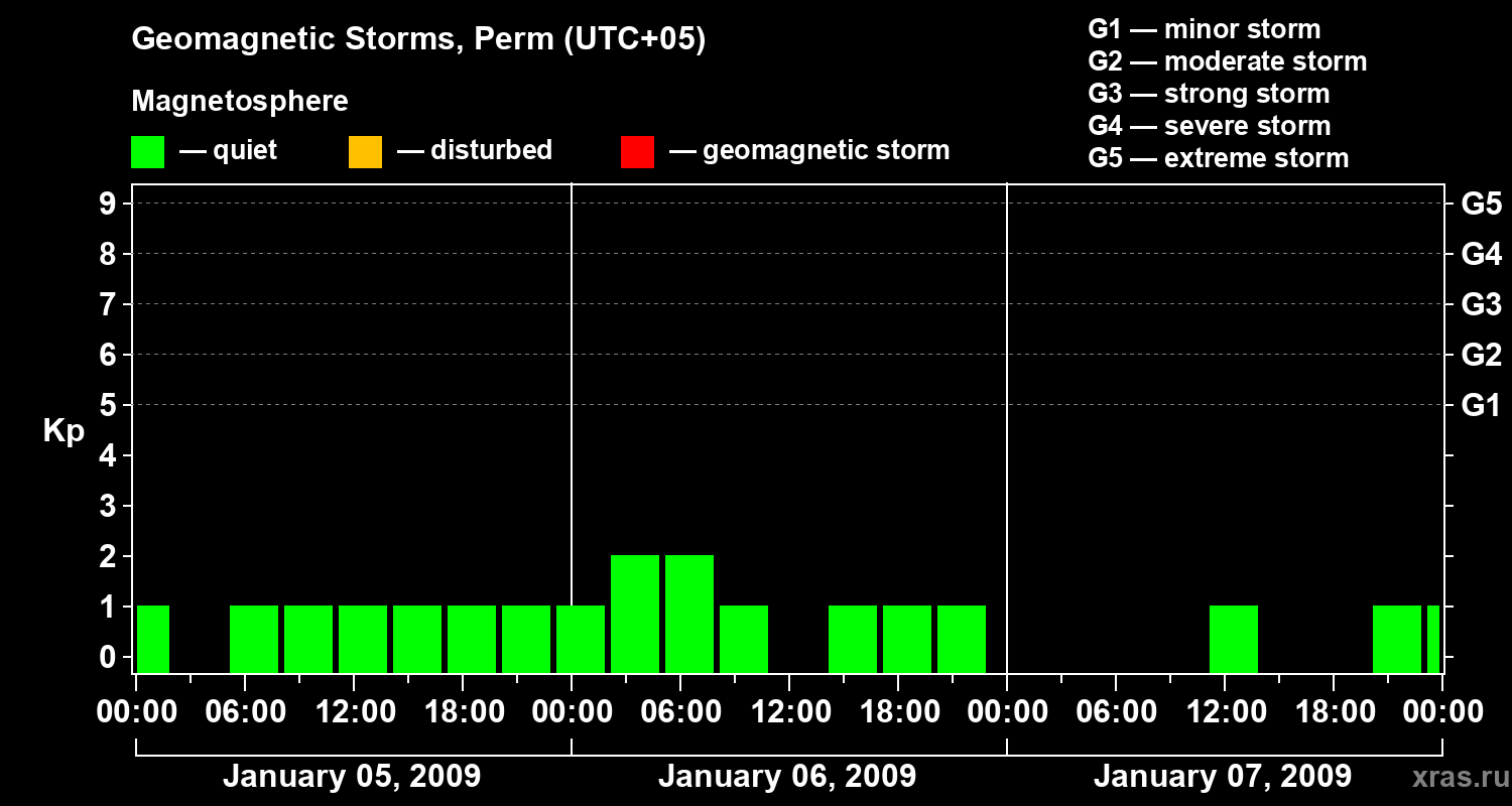 Changes in the geomagnetic index Kp from January 5 to 7, 2009 for mid latitudes