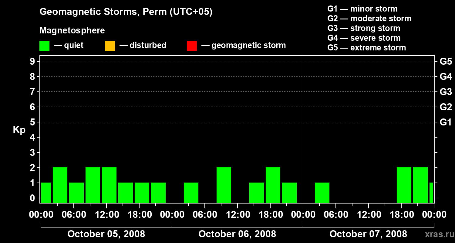 Changes in the geomagnetic index Kp from October 5 to 7, 2008 for mid latitudes