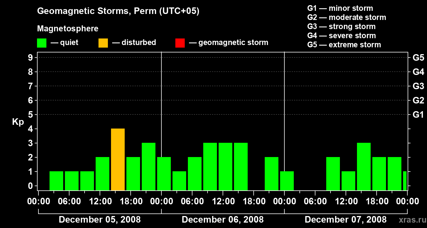 Changes in the geomagnetic index Kp from December 5 to 7, 2008 for mid latitudes