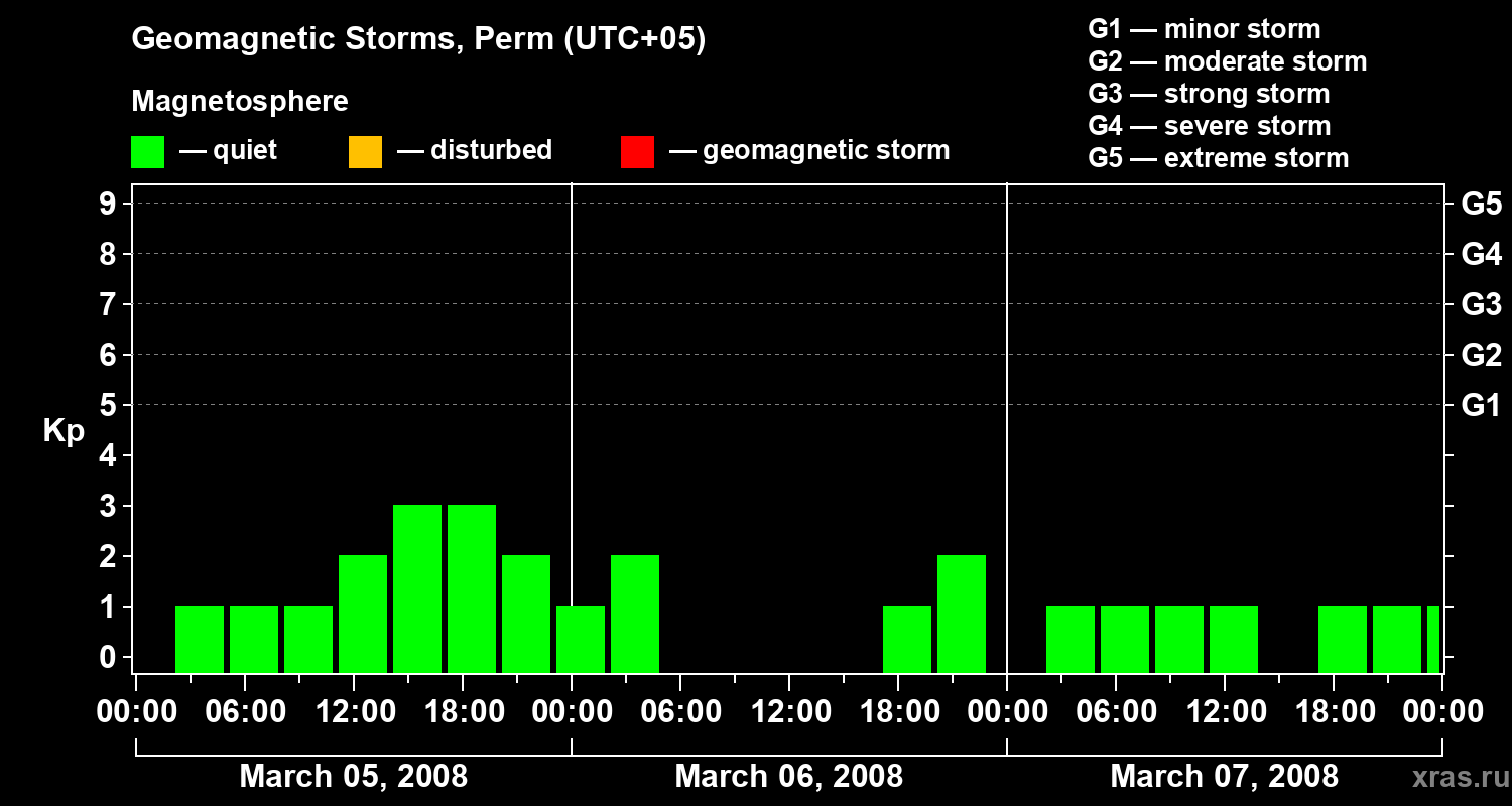 Changes in the geomagnetic index Kp from March 5 to 7, 2008 for mid latitudes