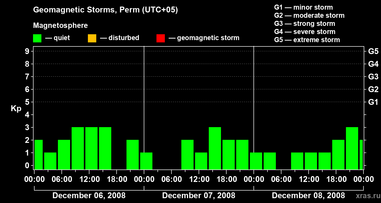 Changes in the geomagnetic index Kp from December 6 to 8, 2008 for mid latitudes