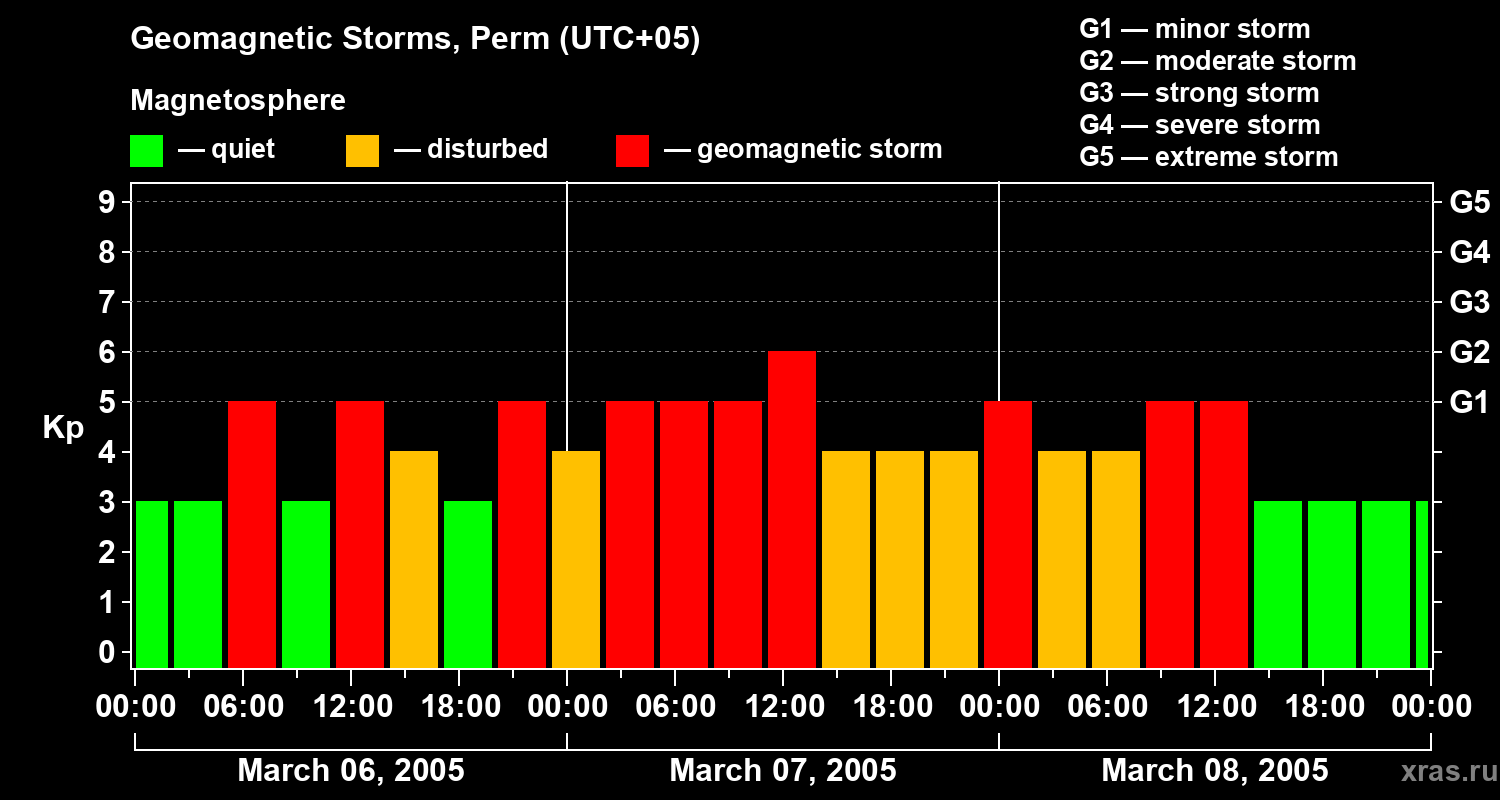 Changes in the geomagnetic index Kp from March 6 to 8, 2005 for mid latitudes