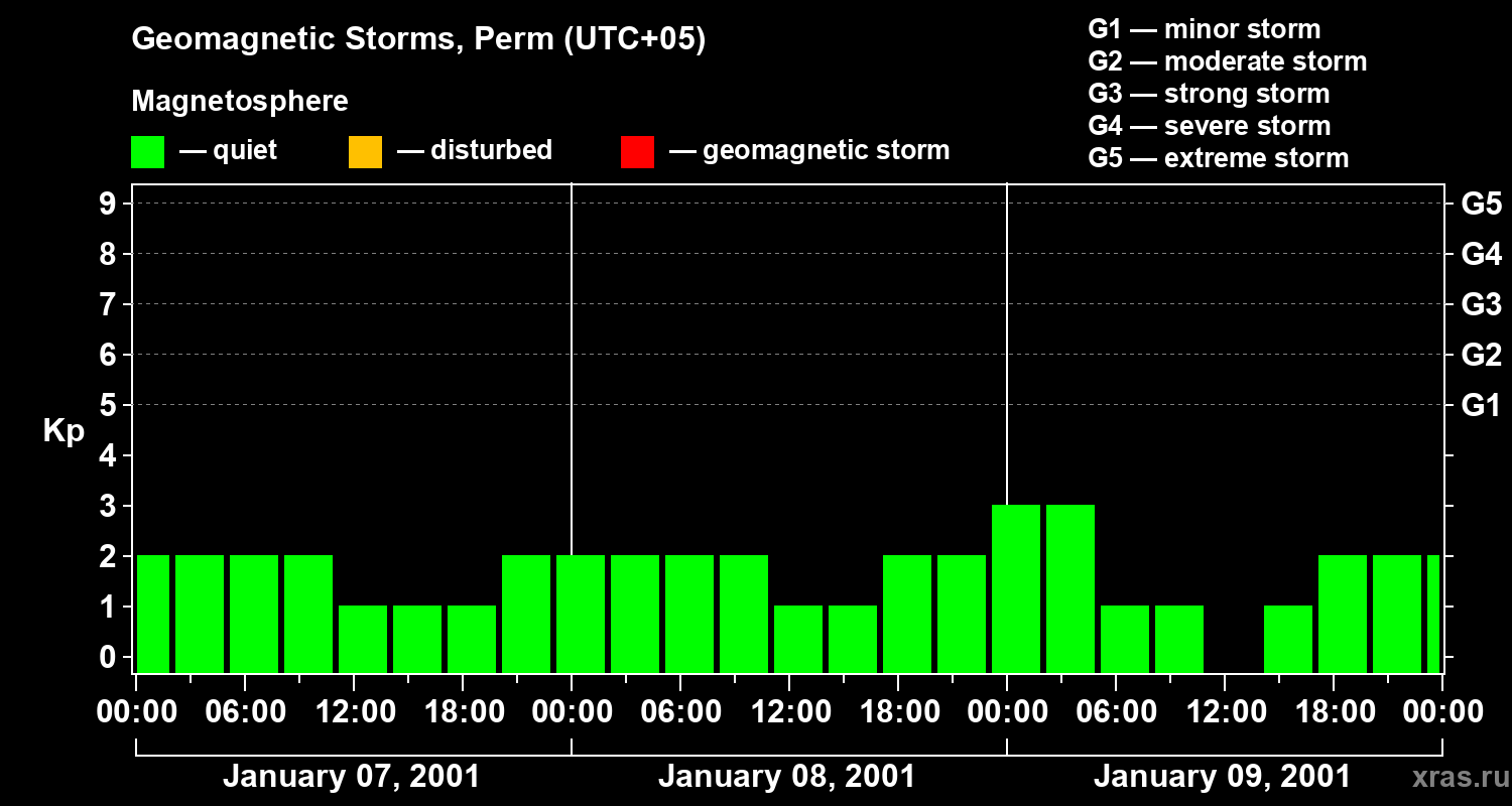 Changes in the geomagnetic index Kp from January 7 to 9, 2001 for mid latitudes