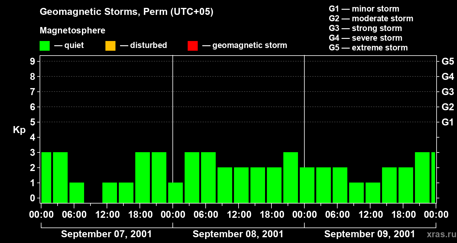 Changes in the geomagnetic index Kp from September 7 to 9, 2001 for mid latitudes