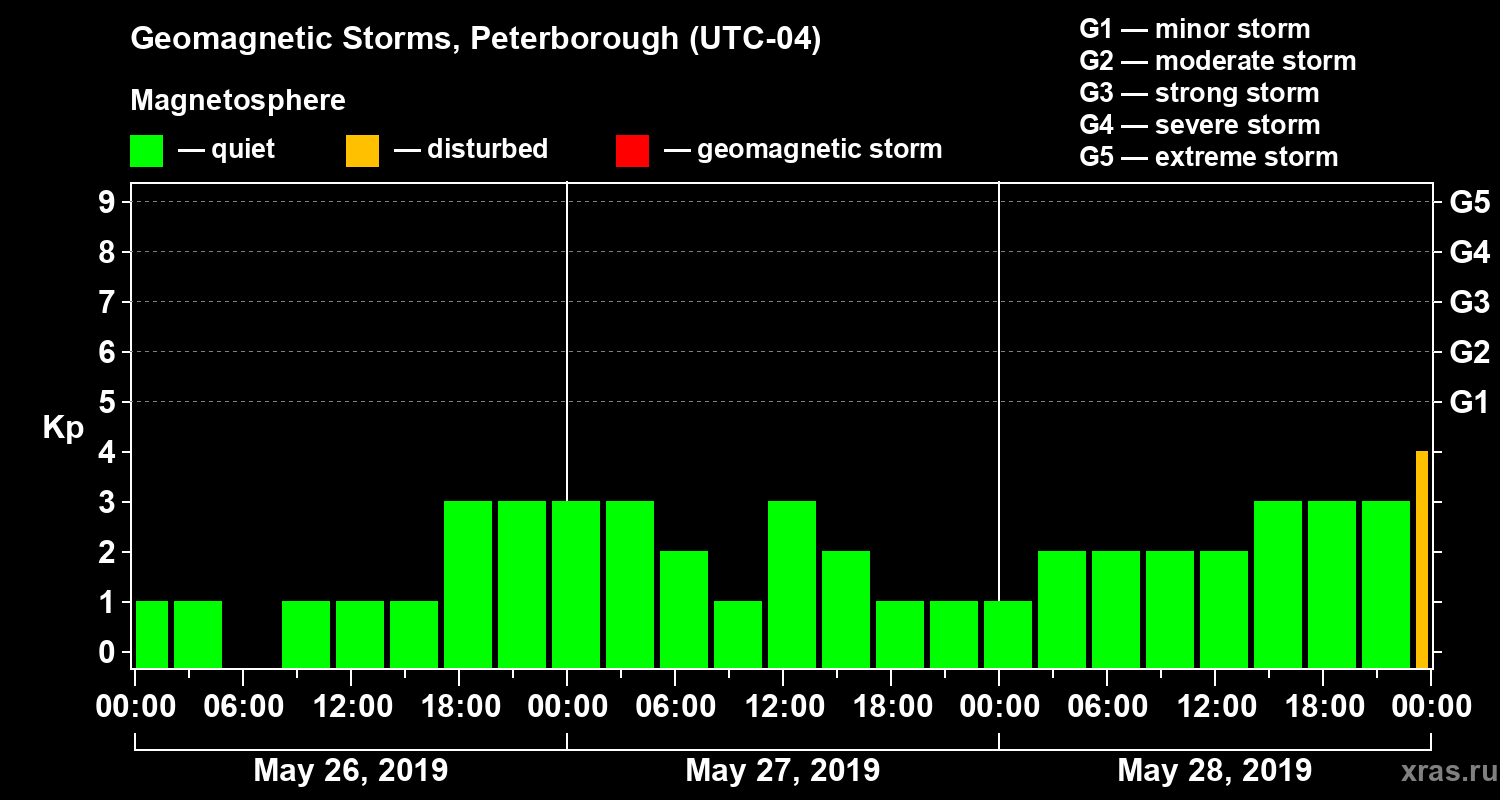 Changes in the geomagnetic index Kp from May 26 to 28, 2019 for mid latitudes