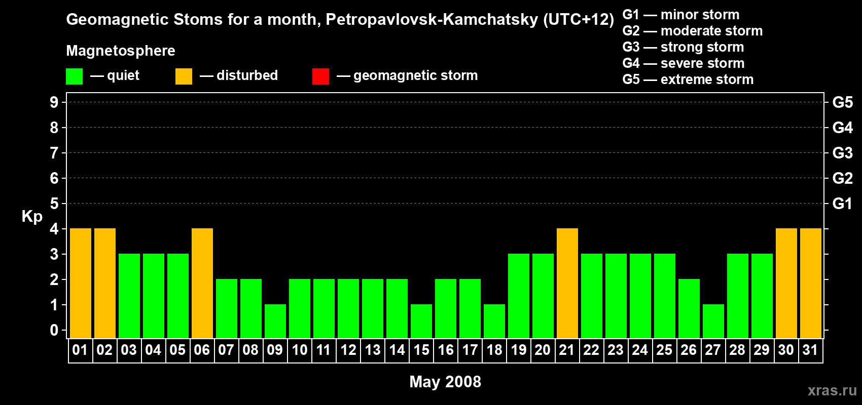 There were no days with an increased level of geomagnetic disturbance in May 2008