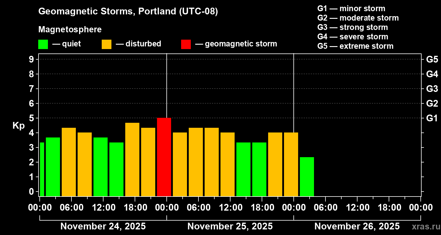Изменения геомагнитного индекса Kp с 24 по 26 ноября 2025 года для средних широт