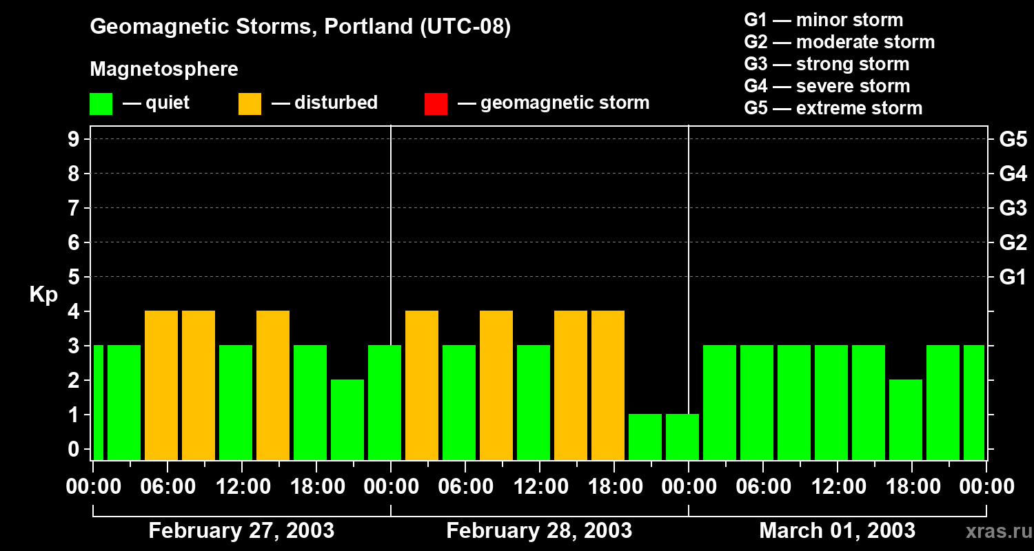 Changes in the geomagnetic index Kp from February 27 to March 1, 2003 for mid latitudes