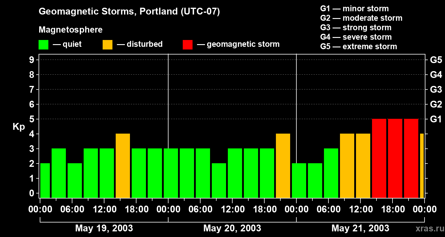 Changes in the geomagnetic index Kp from May 19 to 21, 2003 for mid latitudes