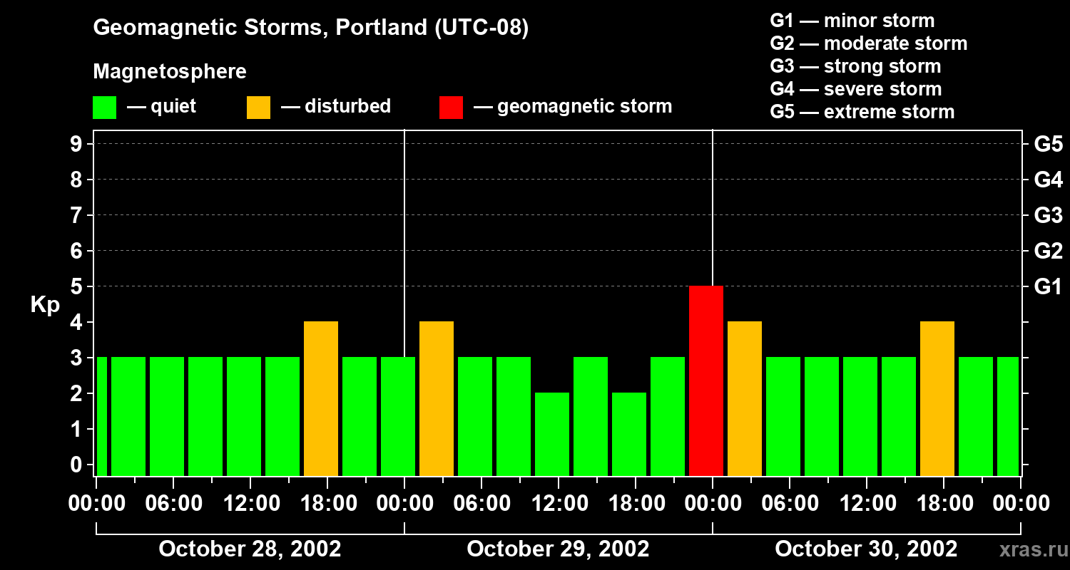 Changes in the geomagnetic index Kp from October 28 to 30, 2002 for mid latitudes