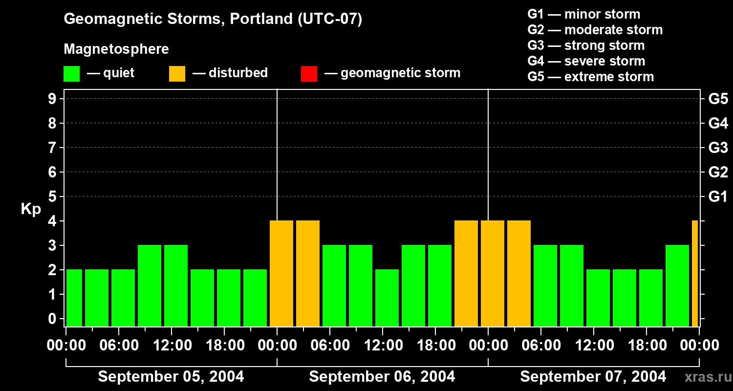 Changes in the geomagnetic index Kp from September 5 to 7, 2004 for mid latitudes