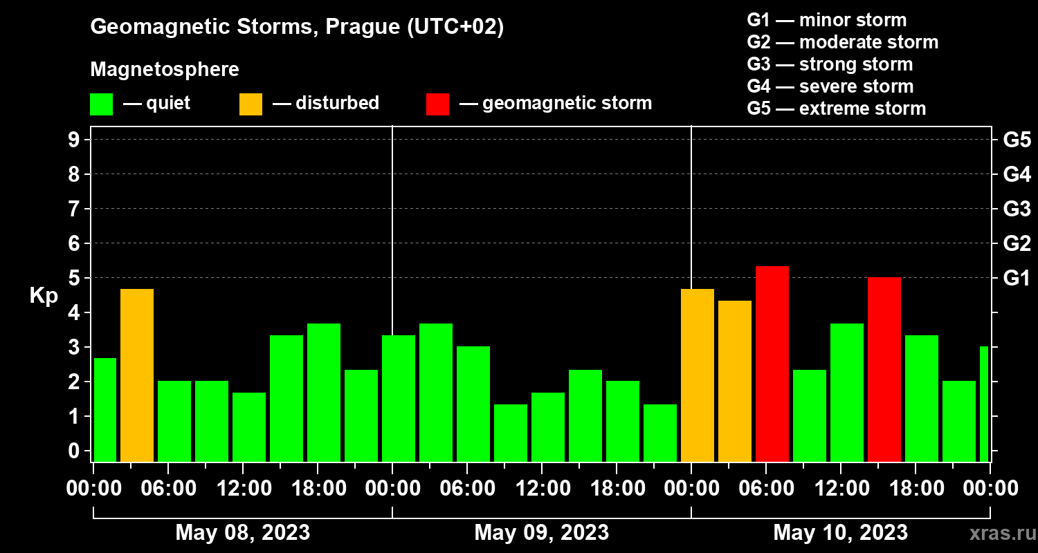 Geomagnetic storms in Prague on May 10, 2023