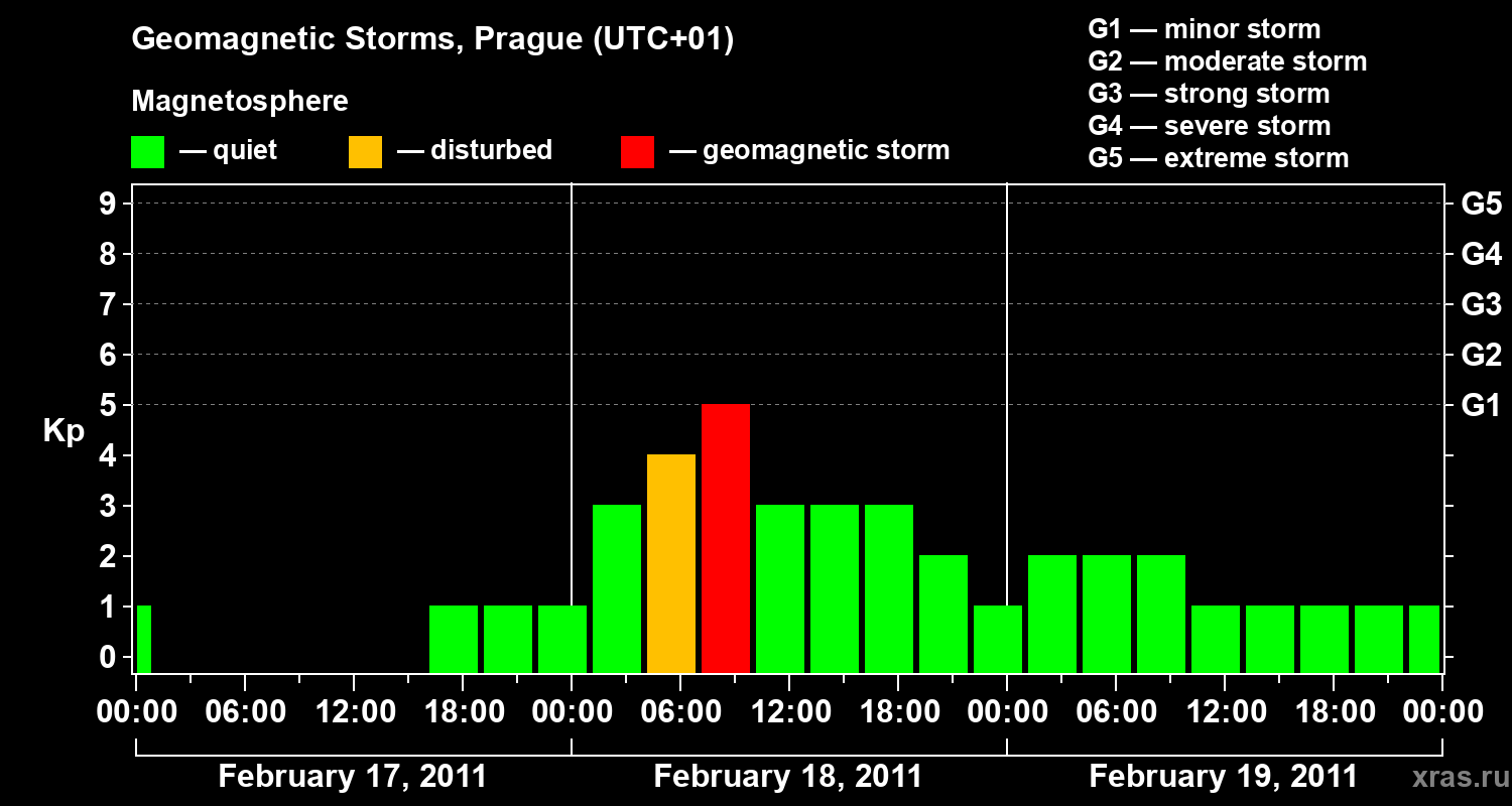 Changes in the geomagnetic index Kp from February 17 to 19, 2011 for mid latitudes