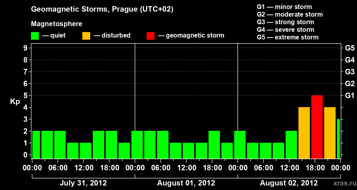 Changes in the geomagnetic index Kp from July 31 to August 2, 2012 for mid latitudes