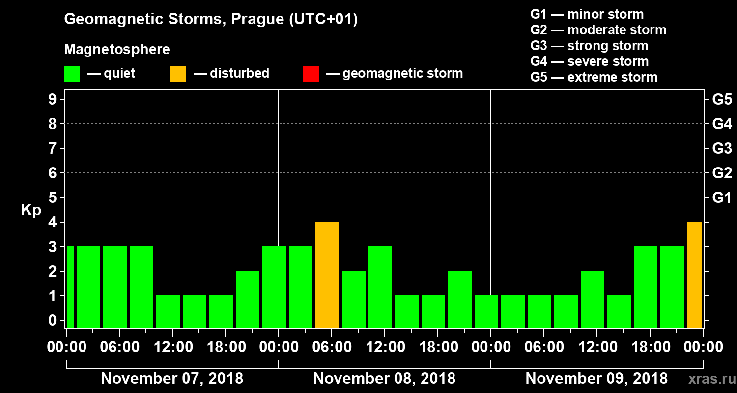 Changes in the geomagnetic index Kp from November 7 to 9, 2018 for mid latitudes