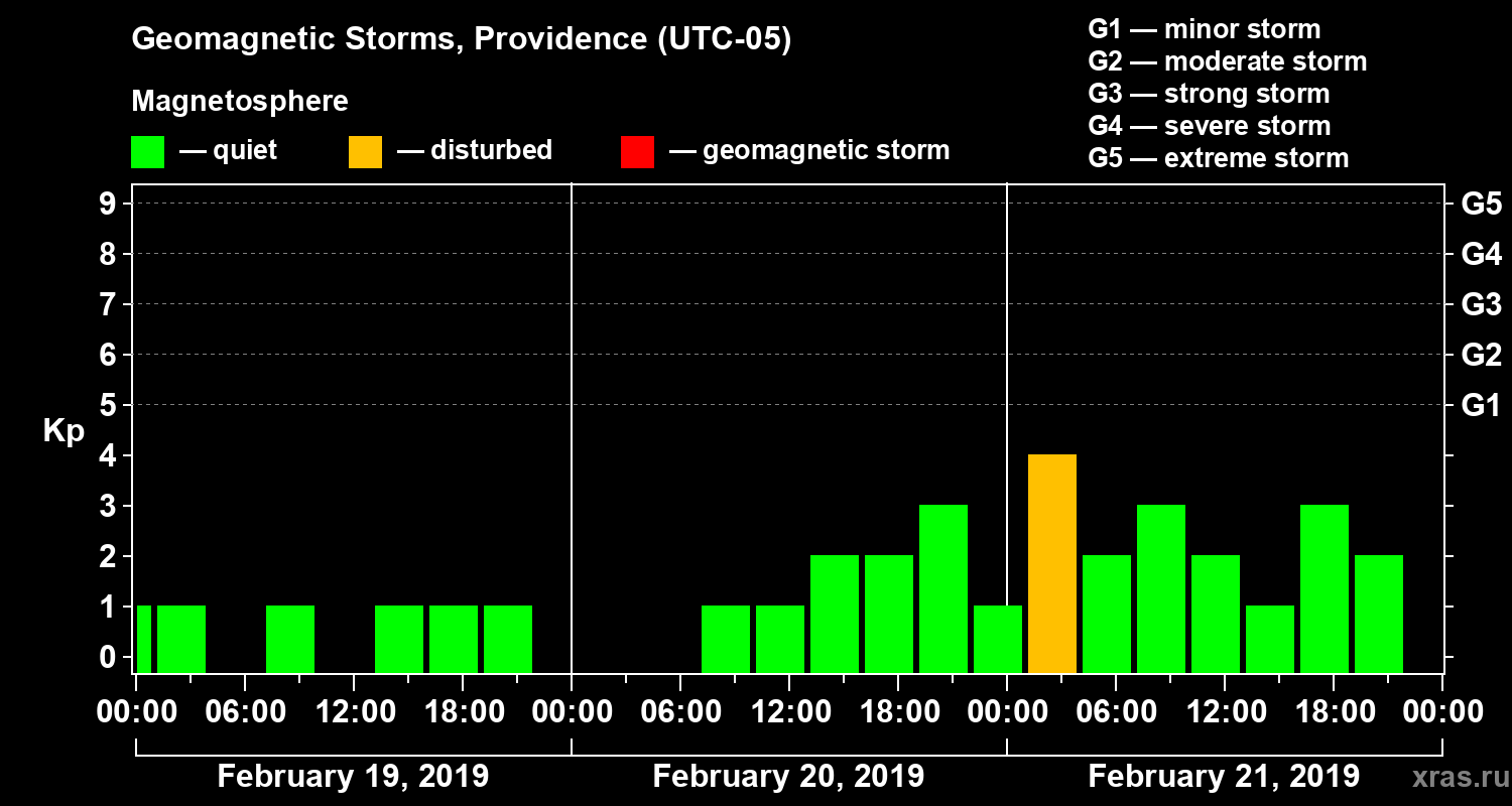 Changes in the geomagnetic index Kp from February 19 to 21, 2019 for mid latitudes