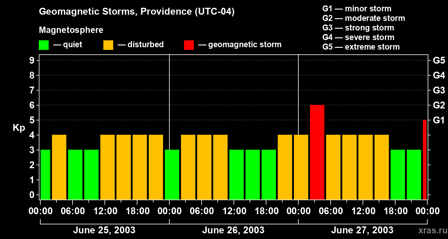 Changes in the geomagnetic index Kp from June 25 to 27, 2003 for mid latitudes