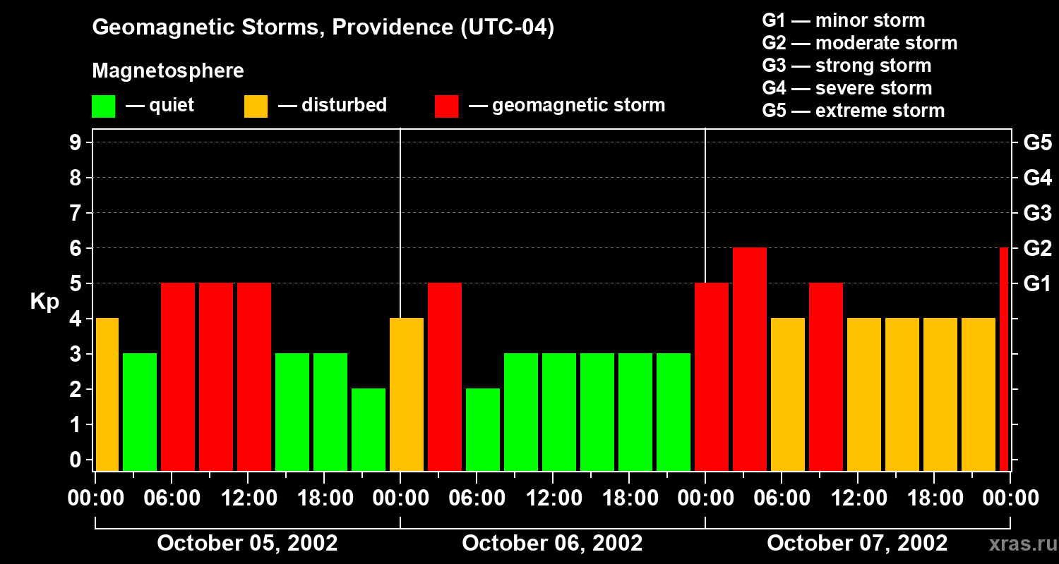 Changes in the geomagnetic index Kp from October 5 to 7, 2002 for mid latitudes