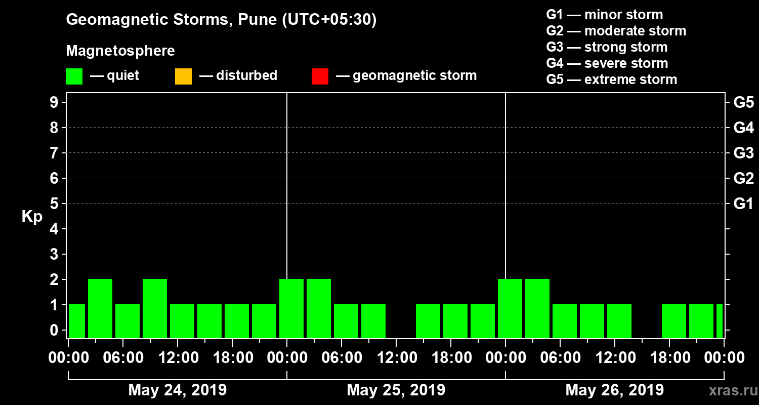 Changes in the geomagnetic index Kp from May 24 to 26, 2019 for mid latitudes