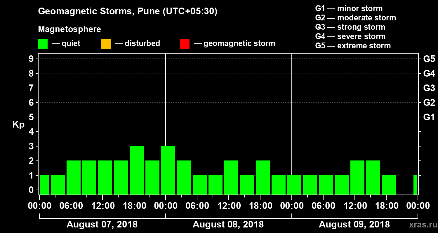 Changes in the geomagnetic index Kp from August 7 to 9, 2018 for mid latitudes