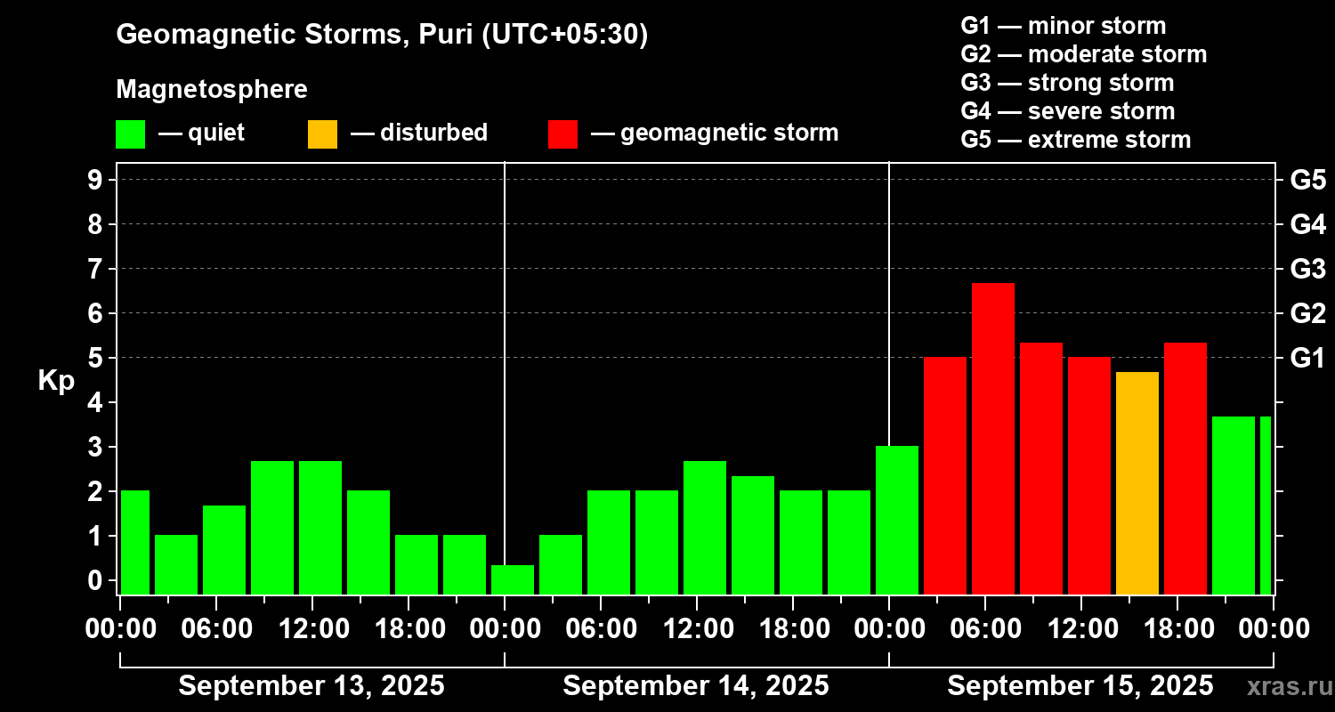Changes in the geomagnetic index Kp from September 13 to 15, 2025 for mid latitudes