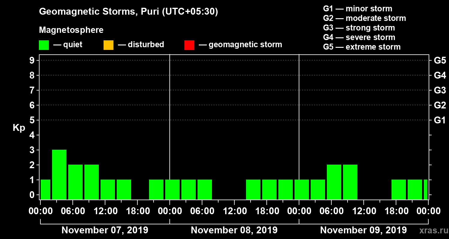 Changes in the geomagnetic index Kp from November 7 to 9, 2019 for mid latitudes