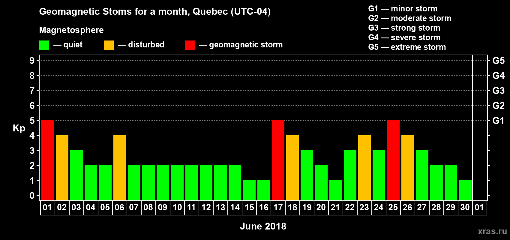 Geomagnetic storms in Quebec on Jun 30, 2018
