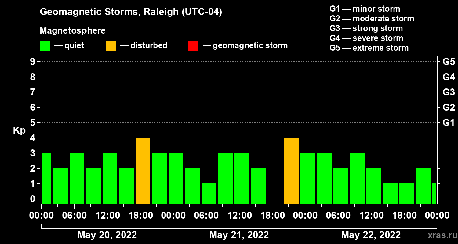Changes in the geomagnetic index Kp from May 20 to 22, 2022 for mid latitudes