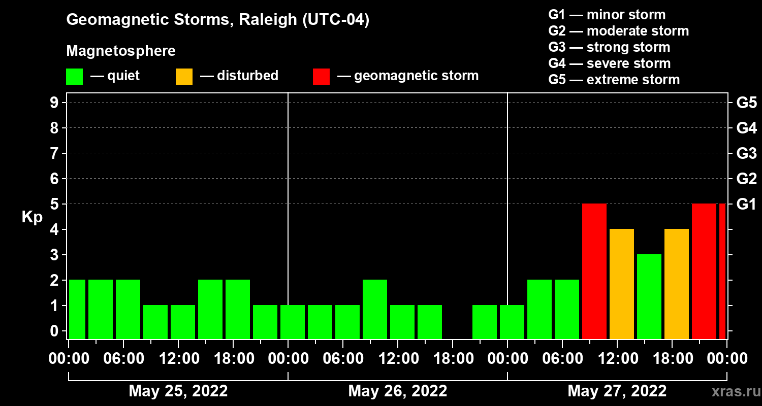 Changes in the geomagnetic index Kp from May 25 to 27, 2022 for mid latitudes