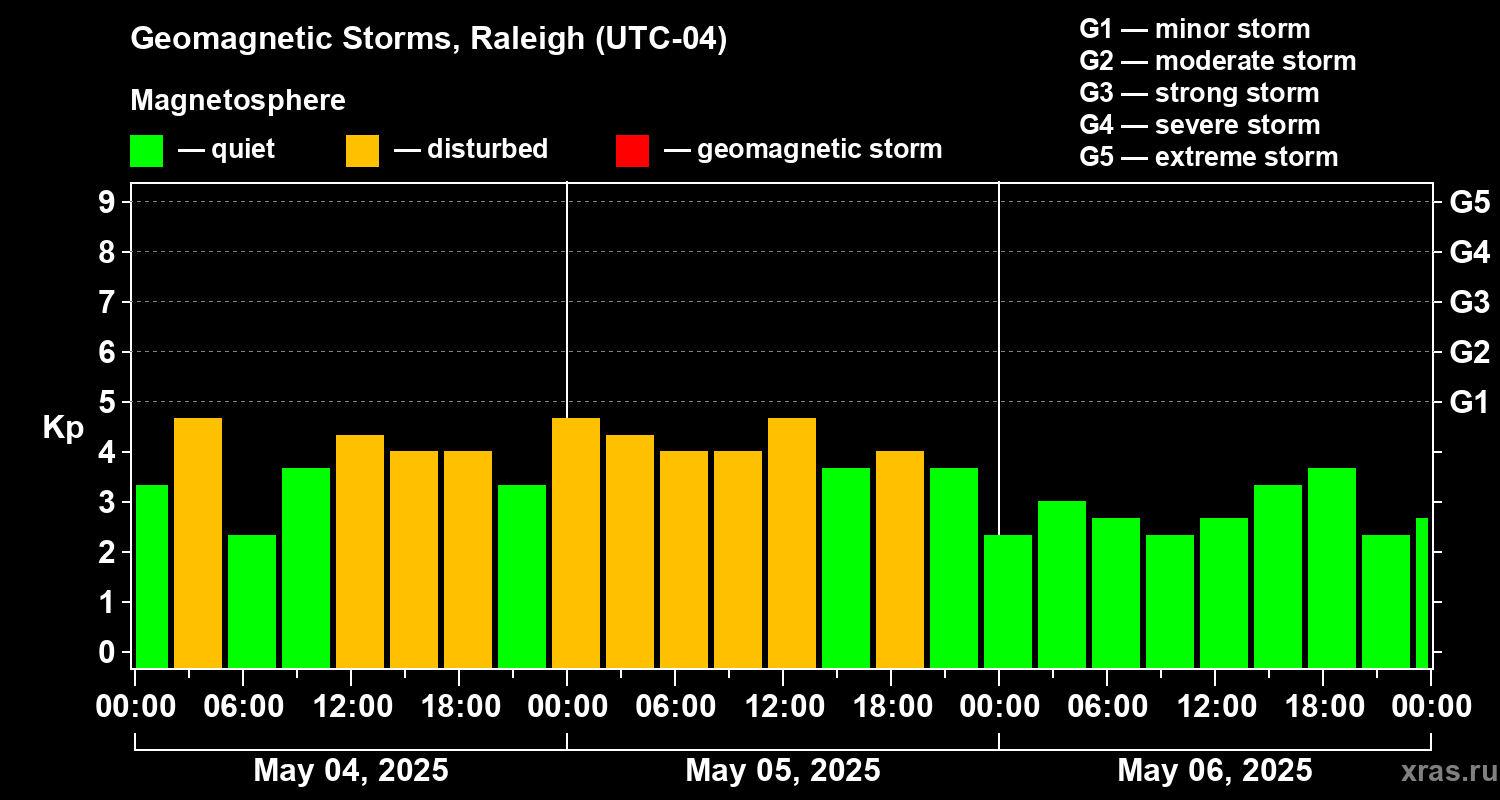 Changes in the geomagnetic index Kp from May 4 to 6, 2025 for mid latitudes