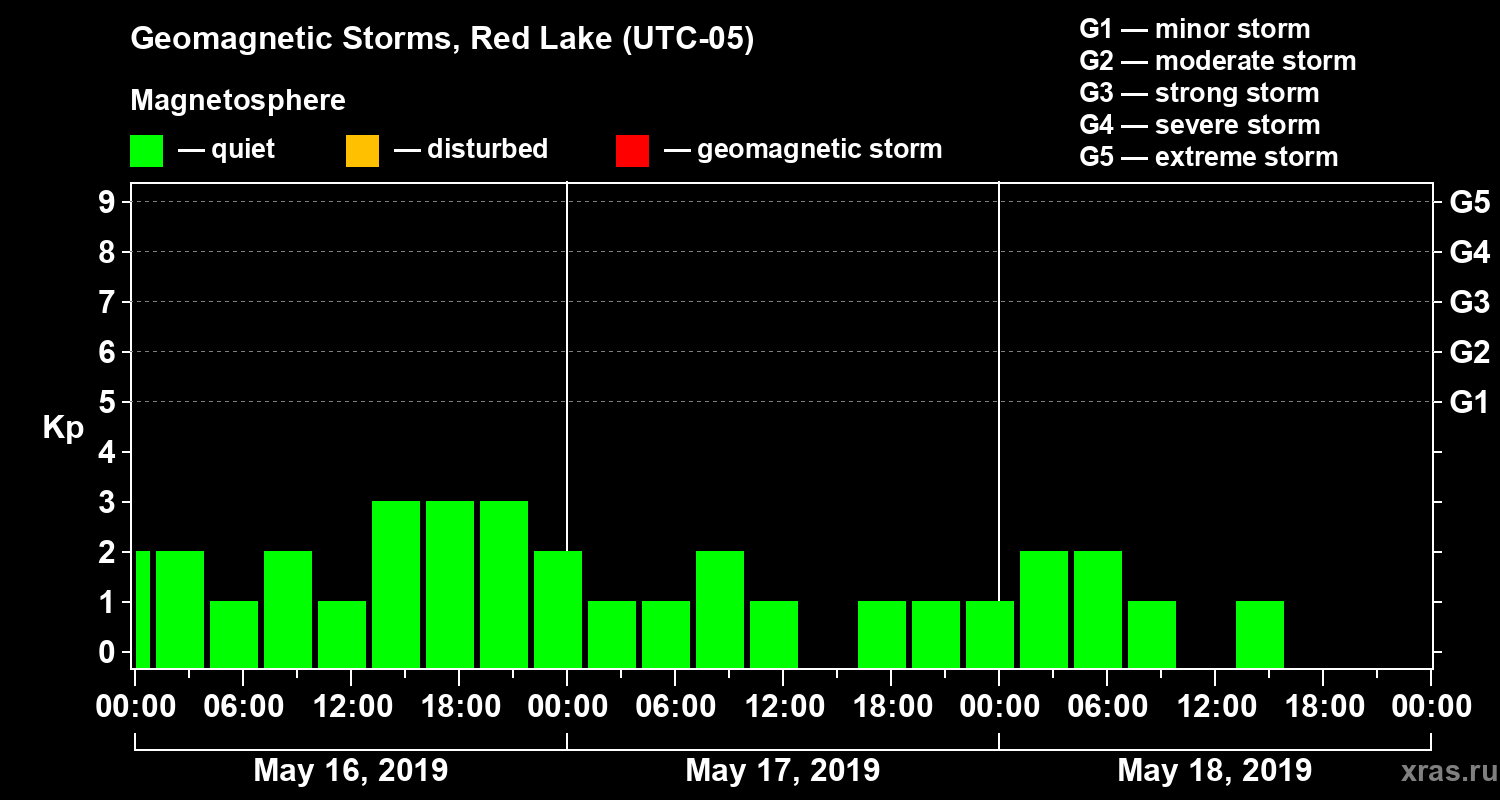 Changes in the geomagnetic index Kp from May 16 to 18, 2019 for mid latitudes