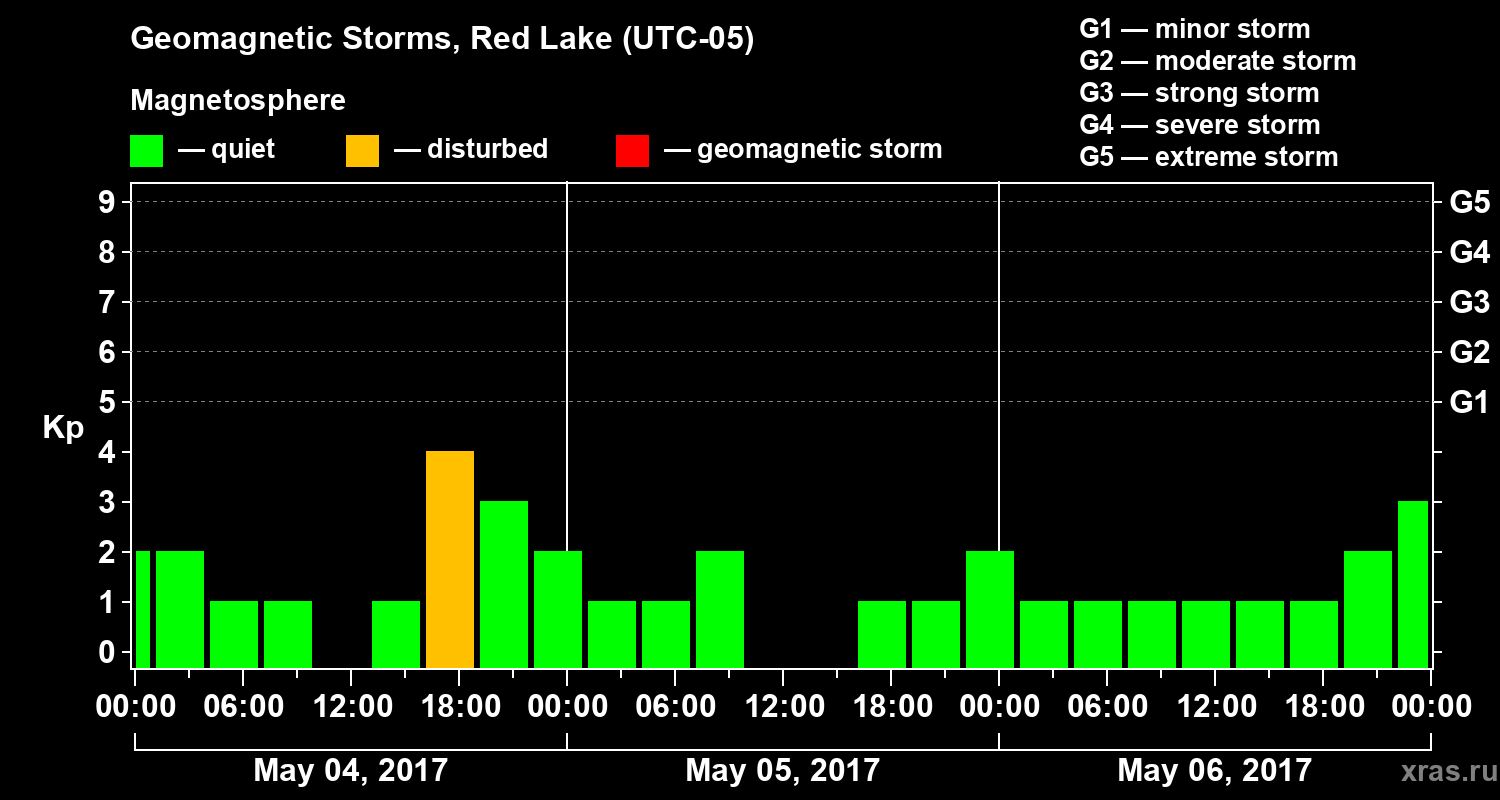 Changes in the geomagnetic index Kp from May 4 to 6, 2017 for mid latitudes