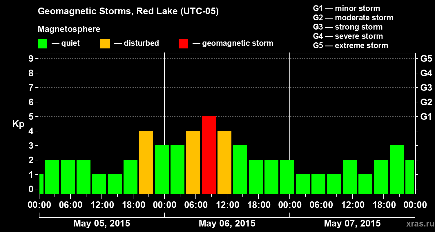 Changes in the geomagnetic index Kp from May 5 to 7, 2015 for mid latitudes