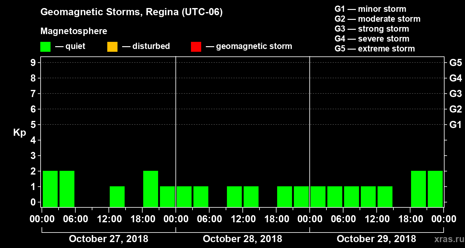 Changes in the geomagnetic index Kp from October 27 to 29, 2018 for mid latitudes