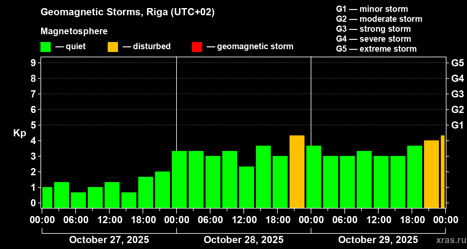 Changes in the geomagnetic index Kp from October 27 to 29, 2025 for mid latitudes