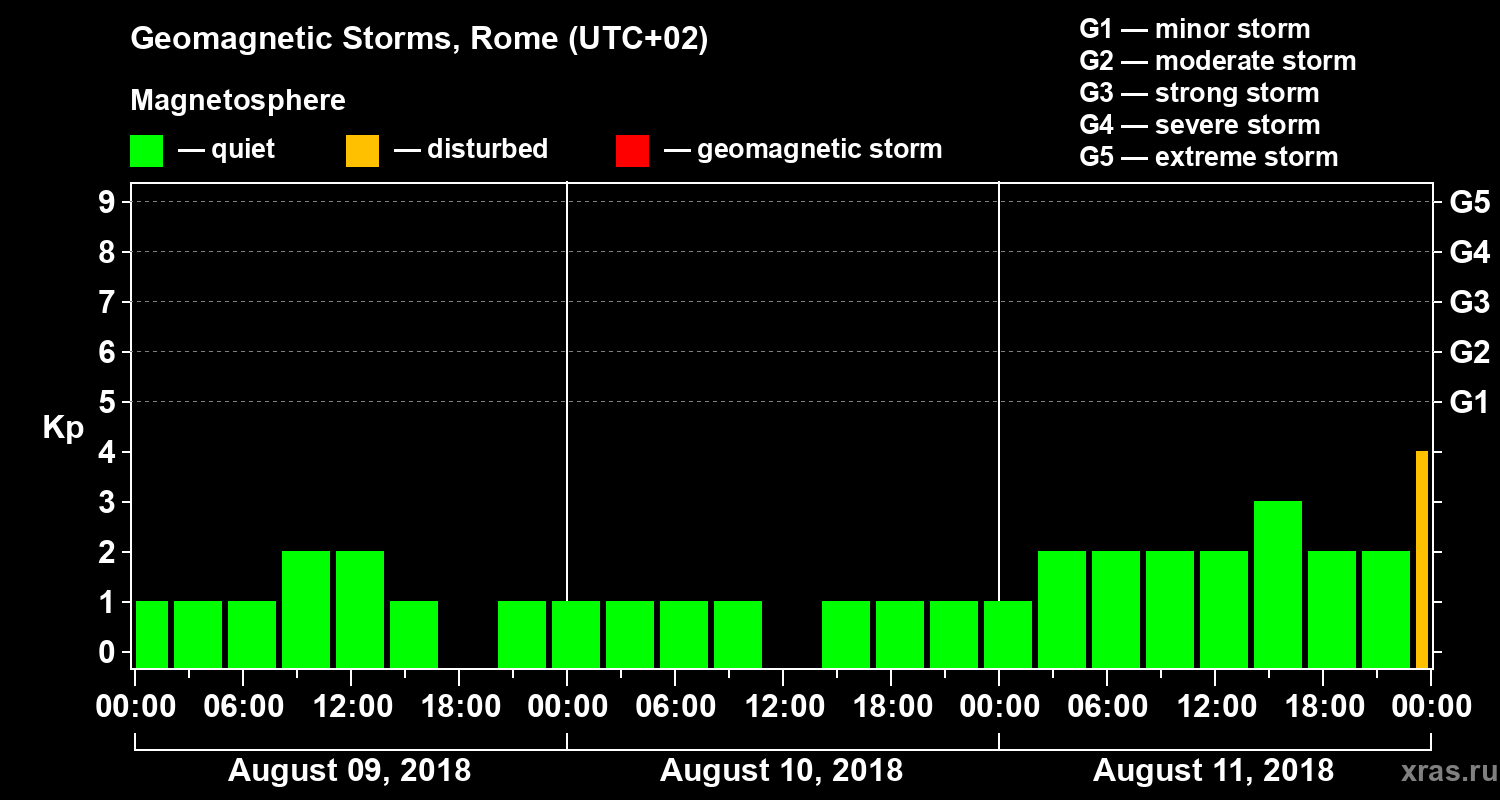 Changes in the geomagnetic index Kp from August 9 to 11, 2018 for mid latitudes