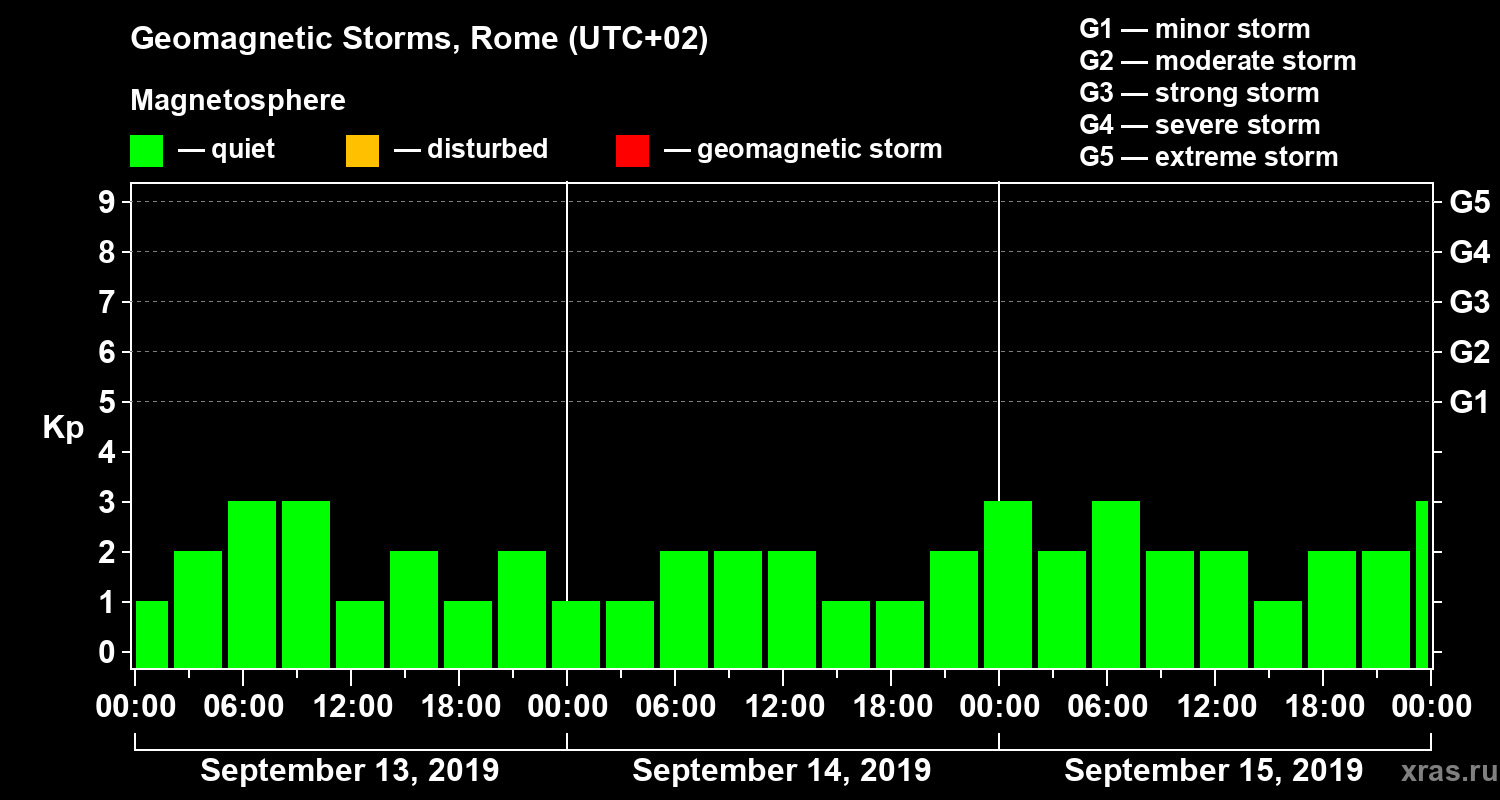 Changes in the geomagnetic index Kp from September 13 to 15, 2019 for mid latitudes