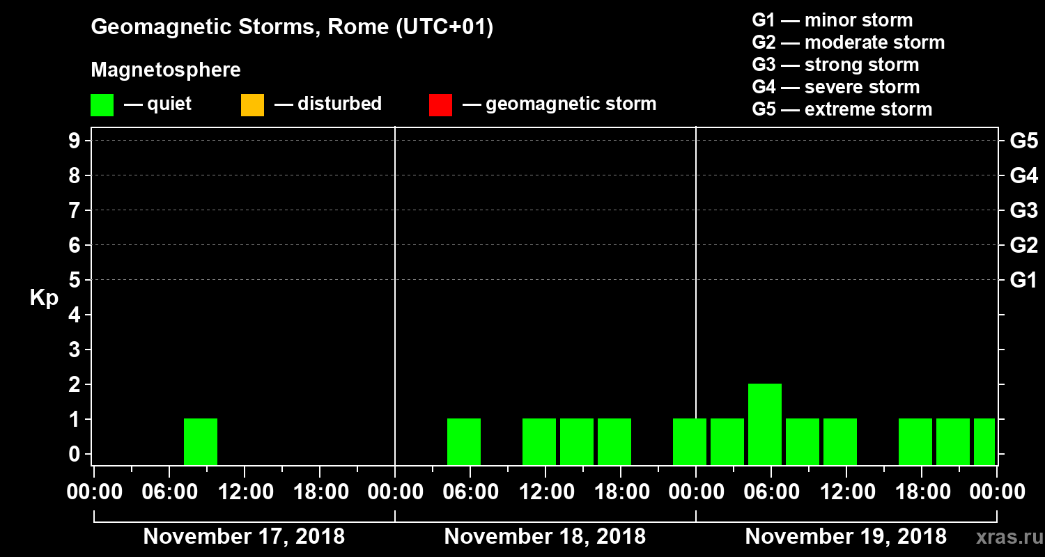 Changes in the geomagnetic index Kp from November 17 to 19, 2018 for mid latitudes